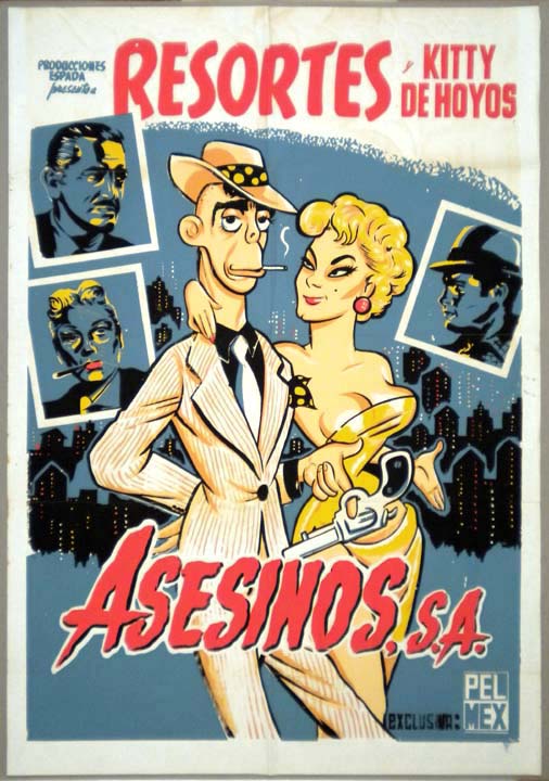 Classic comedy poster shows Resortes, as a 1930's era gangster, with a sexy 'moll' at his side. This is a 'screen' style poster, rather than a typical printed poster... This movie starred Adalberto 'Resortes' Martinez, Wolf Ruvinskis, Luis Aldas, Sara Guash, Guillermo Orea and Lucha Moreno. $95 $75