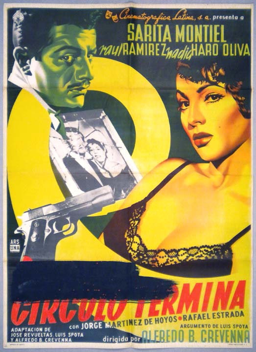 This attractive Mexican movie poster is from a crime melodrama, with film noir overtones. The eye-catching art work features a golden nude woman, two noirish looking men, and a smaller image of a circus clown!... This movie starred Meche Barba, Miguel Torruco, Tony Aguilar, Maria Victoria Gutierrez and Aurora Segura. $75 $55