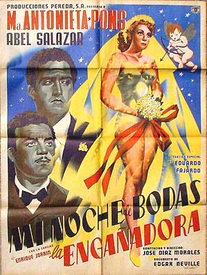 Charming comedy film poster pictures Cupid preparing to shoot his arrow at the sexy Pons, who is wearing a very revealing wedding dress. Two men -- her late husband and future husbands -- look on with interest... This movie starred Maria Antonieta Pons, Abel Salazar, Eduardo Fajardo and Consuelo Guerrero de Luna. $75 $45