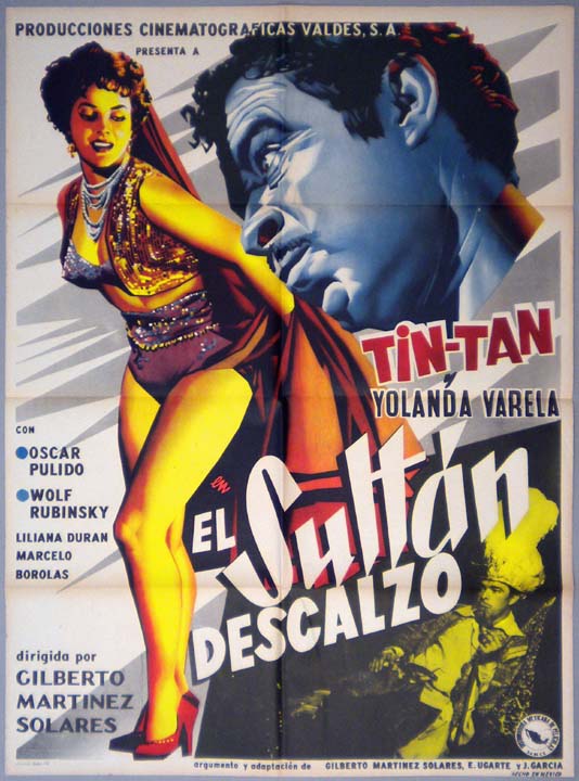 Stylish comedy poster features a great image of comedian Tin Tan and a very sexy image of a scantily-clad Yolanda Varela. This onesheet has the look of a Renau poster, although it is not signed by that artist. Beautiful in any case!... This movie starred German 'Tin Tan' Valdes, Yolanda Varela, Oscar Pulido, Wolf Ruvinskis, Liliana Duran and Marcelo Chavez. $125 $85