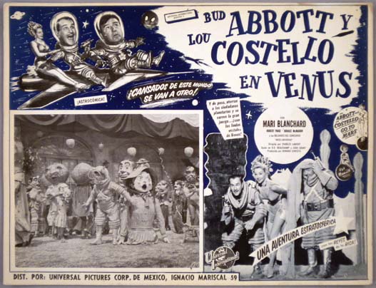 Classic Mexican jumbo lobby card (12.5x16.5") from the 1953 Universal sci-fi / comedy film, ABBOTT and COSTELLO GO TO MARS, which starred Bud Abbott, Lou Costello, Robert Paige, Mari Blanchard and Martha Hyer. The film was directed by Charles Lamont. $25 |