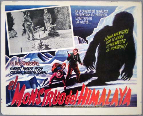 Beautiful Mexican jumbo lobby card (12.25x16.75") from the 1957 20th Century Fox / Hammer sci-fi / horror film, THE ABOMINABLE SNOWMAN OF THE HIMALAYAS, which starred Forrest Tucker, Peter Cushing, Maureen Connell and Richard Wattis. The film was directed by Val Guest. $25 |