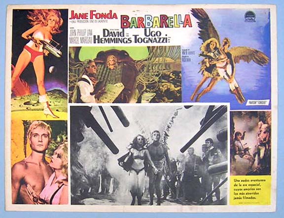 Beautiful Mexican jumbo lobby card (12.5x16.5") from the 1968 Paramount sci-fi / satire film, BARBARELLA, which starred Jane Fonda, John Phillip Law, Anita Pallenberg, Milo O'Shea, Marcel Marceau and Claude Dauphin. $25 each |