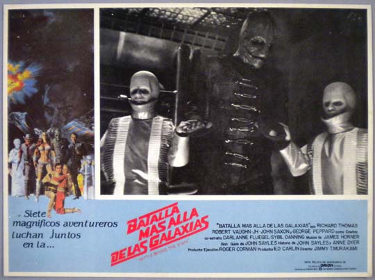Beautiful Mexican jumbo lobby card (12.25x16.5") from the 1980 New World sci-fi film, BATTLE BEYOND THE STARS, which starred Richard Thomas, Robert Vaughn, John Saxon, George Peppard, Darlanne Fluegel and Sybil Danning. The film was directed by Roger Corman. $20 |