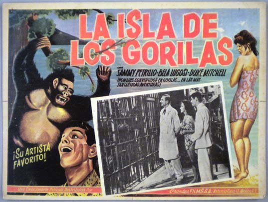 Beautiful Mexican jumbo lobby card (12x15.75") from the 1952 Realart sci-fi / comedy / jungle adventure film, BELA LUGOSI MEETS A BROOKLYN GORILLA, which starred Bela Lugosi, Duke Mitchell, Sammy Petrillo, Charlita, Muriel Landers, Al Kikume and Ray 'Crash' Corrigan. $35 |