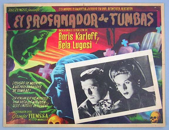 Beautiful Mexican jumbo lobby card (12x16") from the 1945 RKO horror film, THE BODY SNATCHER, which starred Boris Karloff, Bela Lugosi, Henry Daniell, Edith Atwater, Russell Wade and Rita Corday. The film was directed by Robert Wise, produced by Val Lewton, and was based on a novel by Robert Louis Stevenson. $25 |