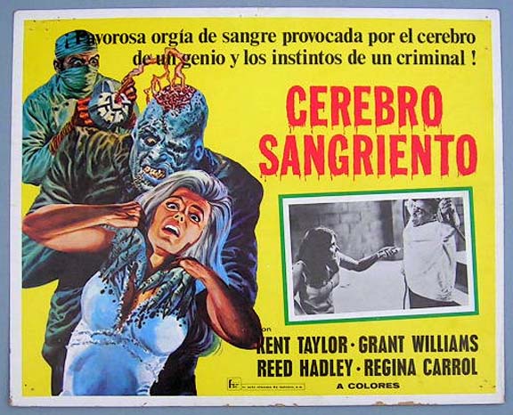 Beautiful Mexican jumbo lobby card (12x15") from the 1972 International Pictures horror / sci-fi film, BRAIN OF BLOOD, which starred Grant Williams, Kent Taylor, John Bloom, Regina Carrol, Vicki Volante, Reed Hadley and Angelo Rossitto. The film was directed by Al Adamson. $20 each |