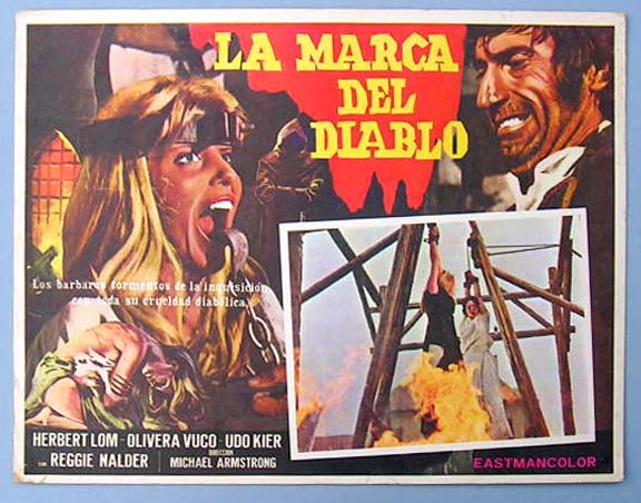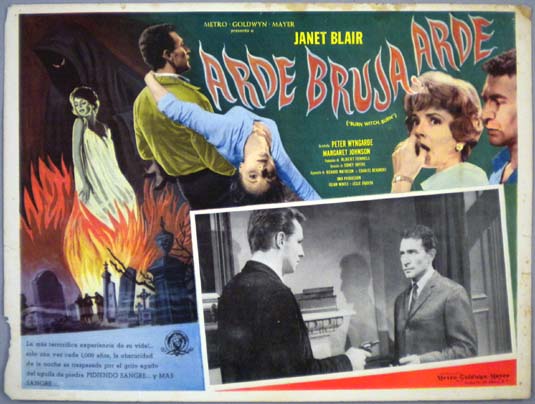Beautiful Mexican jumbo lobby card (12.5x16.5") from the 1962 British horror film, BURN WITCH, BURN, which starred Peter Wyngarde, Janet Blair, Margaret Johnston, Anthony Nicholls and Colin Gordon. There is some wear on the borders, but the image area is in nice shape. $15 |