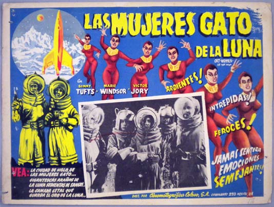 Beautiful Mexican jumbo lobby card (12.75x17") from the 1954 Astor sci-fi film, CAT-WOMEN OF THE MOON, which starred Sonny Tufts, Marie Windsor, Victor Jory, Susan Morrow, Douglas Fowley, Bill Phipps and Carol Brewster. $75 |