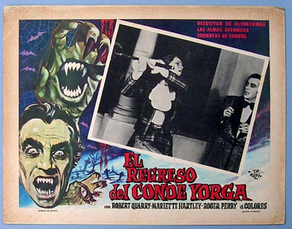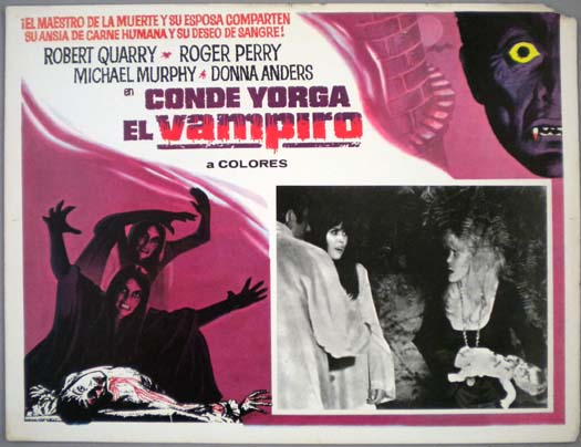Beautiful Mexican jumbo lobby card (12.5x16.5") from the 1971 AIP horror / vampire film, THE RETURN OF COUNT YORGA, which starred Robert Quarry, Mariette Hartley, Roger Perry, Yvonne Wilder, Tom Toner, Rudy De Luca, Philip Frame, George Macready, Walter Brooke, Edward Walsh, Craig T. Nelson, David Lampson and Karen Ericson. The film was directed by Bob Kelljan. $20 each |
