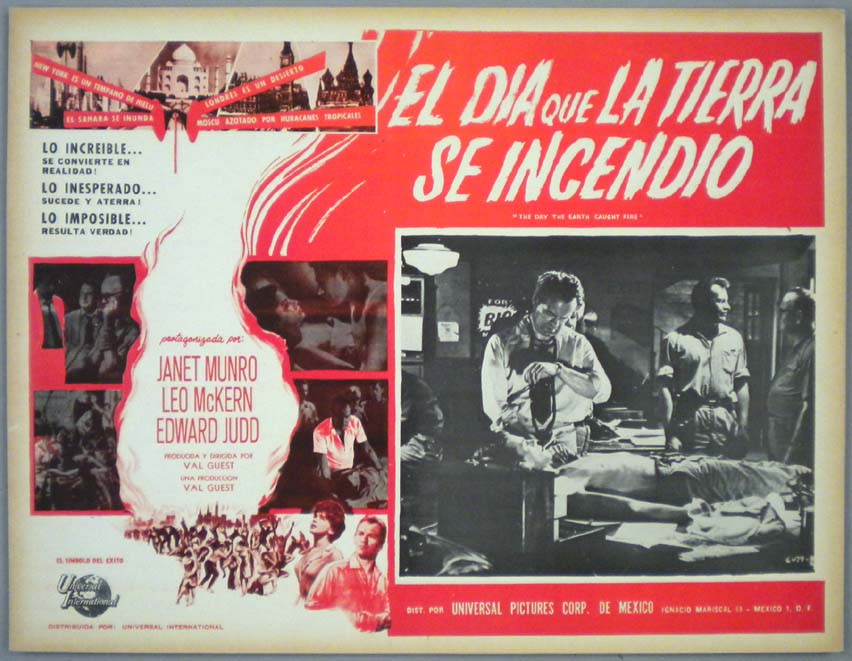 Classic Mexican jumbo lobby card (12.5x16.25") from the 1961 British sci-fi film, THE DAY THE EARTH CAUGHT FIRE, which starred Janet Munro, Leo McKern, Edward Judd and Michael Goodliffe. In my opinion, this was the best sci-fi movie of the 1960s. $20 |