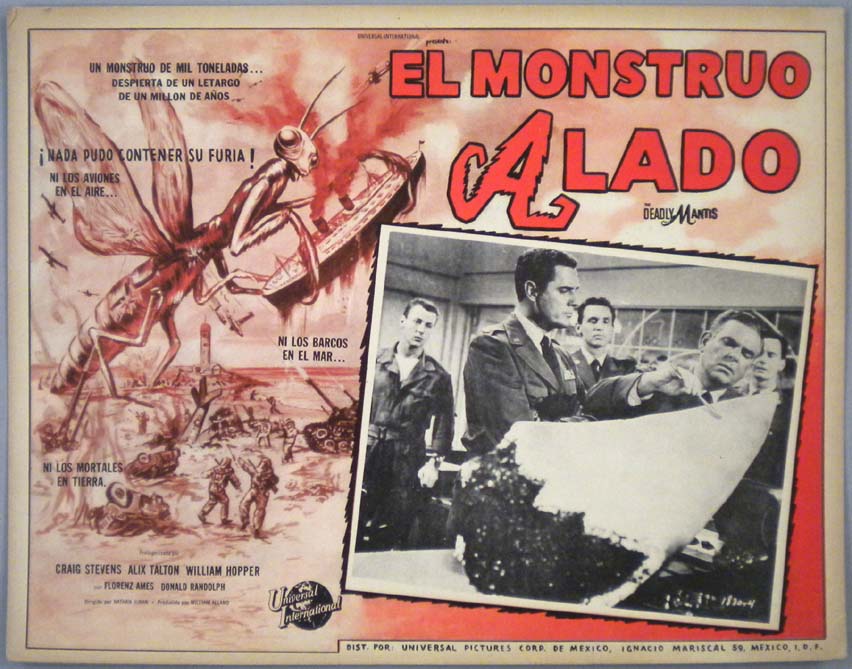 Classic Mexican jumbo lobby card (12.75x16.25") from the 1957 Universal sci-fi / monster film, THE DEADLY MANTIS, which starred Craig Stevens, William Hopper, Alix Talton and Donald Randolph. $35 each |