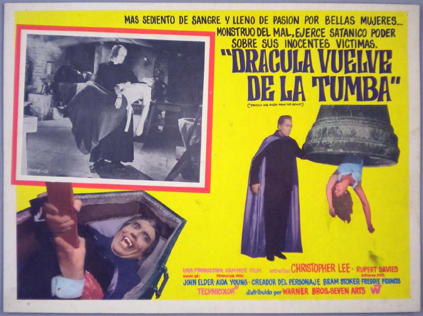 Beautiful Mexican jumbo lobby card (11.75x16") from the 1968 Hammer horror / vampire film, DRACULA HAS RISEN FROM THE GRAVE, which starred Christopher Lee, Rupert Davies, Veronica Carlson and Barbara Ewing. $20 each |