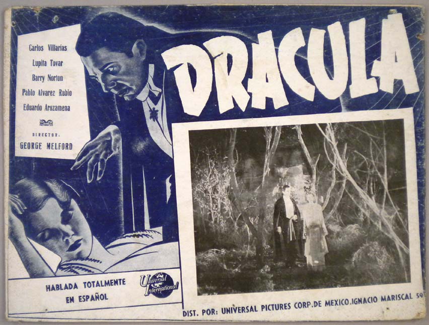 Wonderful Mexican jumbo lobby card (12.25x16.25") from the 1931 Universal horror / vampire film, DRACULA, which starred Carlos Villarias, Lupita Tovar, Barry Norton, Pablo Alvarez Rubio and Eduardo Arozamena. This Spanish language version of the classic horror movie was filmed concurrently with the better known Tod Browning/Bela Lugosi version. This is an early and extremely rare lobby card -- likely released in the late 1940s -- almost no original material exists on this title. It is printed on heavy cardboard. $395 |