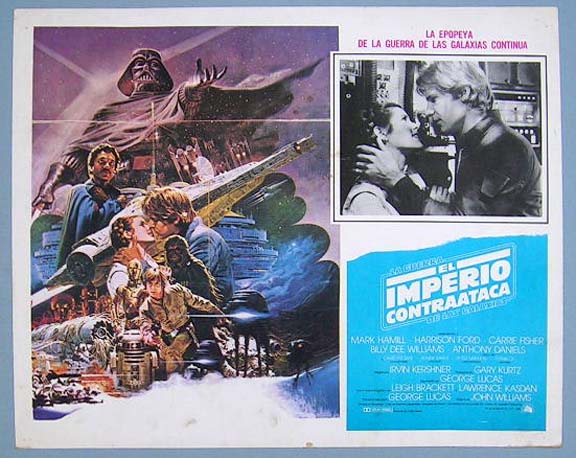Beautiful Mexican lobby card (11x14") from the 1980 20th Century Fox sci-fi film, EMPIRE STRIKES BACK, which starred Mark Hamill, Harrison Ford, Carrie Fisher, Billy Dee Williams, Anthony Daniels and David Prowse. This was, of course, the second film in the original 'Star Wars' trilogy. $45 each |