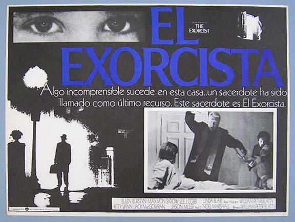 Beautiful Mexican jumbo lobby card (12.5x16.5") from the 1973 Warner Brothers horror film, THE EXORCIST, which starred Ellen Burstyn, Max von Sydow, Lee J. Cobb, Kitty Winn, Jack MacGowran, Jason Miller and Linda Blair. $20 each |