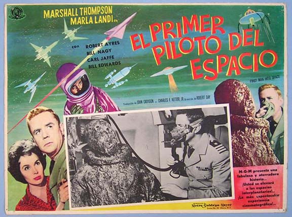 Beautiful Mexican jumbo lobby card (12.5x16.5") from the 1959 MGM sci-fi / monster film, FIRST MAN INTO SPACE, which starred Marshall Thompson, Marla Landi, Bill Edwards, Robert Ayres, Bill Nagy and Carl Jaffe. $25 each |