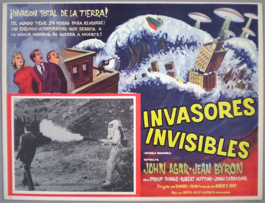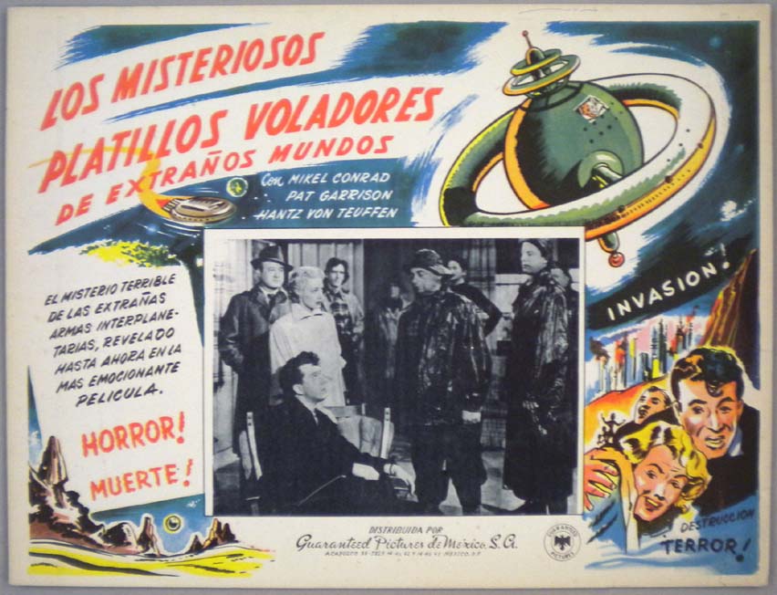 Beautiful Mexican jumbo lobby card (12.5x16.25") from the 1950 Film Classics sci-fi / red scare film, THE FLYING SAUCER, which starred Mikel Conrad, Pat Garrison, Hantz von Teuffen, Earle Lyon and Lester Sharpe. $25 |