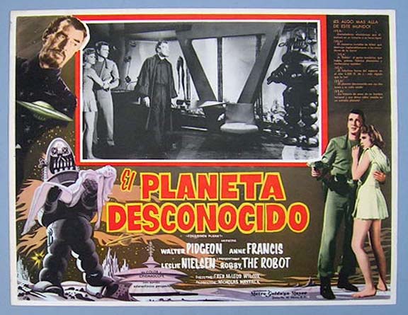 Beautiful Mexican jumbo lobby card (12.5x16.5") from the 1956 MGM sci-fi film, FORBIDDEN PLANET, which starred Walter Pidgeon, Anne Francis, Leslie Nielsen, Warren Stevens, Jack Kelly, Richard Anderson, Earl Holliman and Robby the Robot. $150 each |