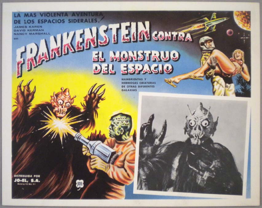 Beautiful Mexican lobby card (11x14") from the 1965 Allied Artists horror / sci-fi film, FRANKENSTEIN MEETS THE SPACE MONSTER, which starred Marilyn Hanold, Lou Cutell, Robert Reilly and James Karen. $35 |