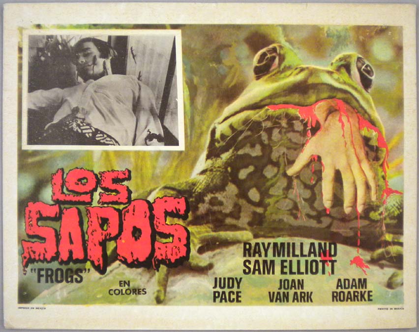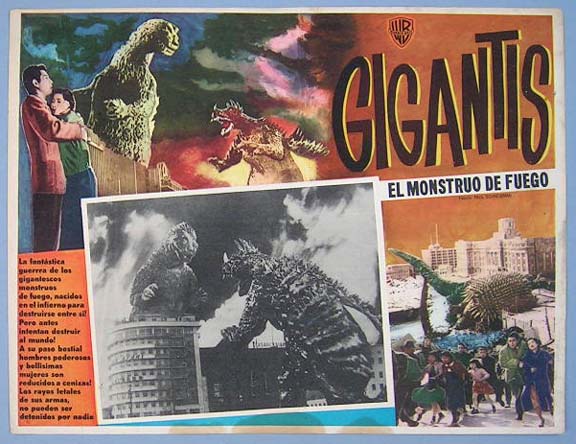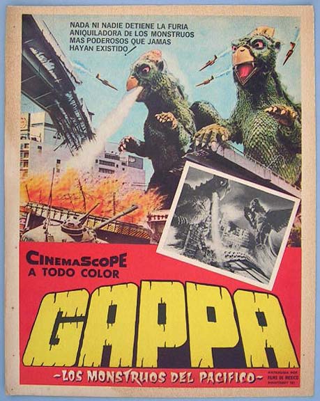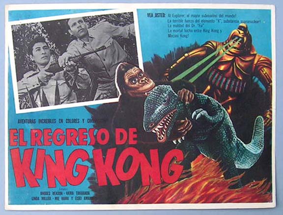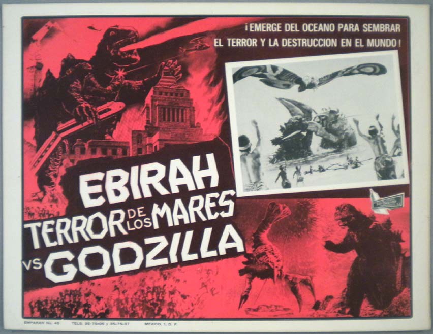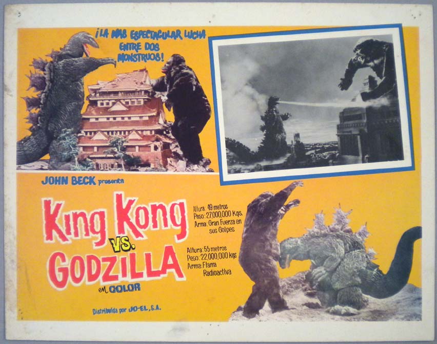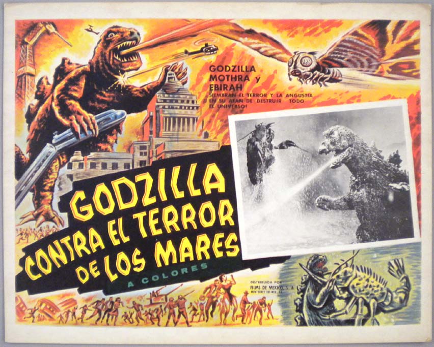 Great Mexican jumbo lobby card (13x15.5") from the 1966 Toho / Japanese sci-fi / giant monster film, WAR OF THE GARGANTUAS, which starred Russ Tamblyn, Kumi Mizuno, Kenji Sahara, Nobuo Nakamura, Jun Tazaki and Kipp Hamilton. $20 each |