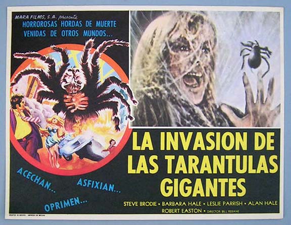 Classic Mexican jumbo lobby card (12.75x16.5") from the 1955 Universal sci-fi / monster film, TARANTULA, which starred John Agar, Mara Corday, Leo G. Carroll, Nestor Paiva, Ross Elliott and Clint Eastwood. The film was directed by Roger Corman and was based on stories by Edgar Allan Poe. $35 each |