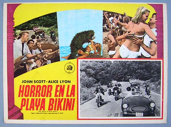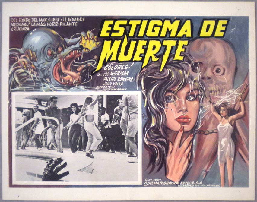 Beautiful Mexican lobby card (11x14") from the 1965 Essen Prod. horror / sci-fi film, STING OF DEATH, which starred Joe Morrison, Valerie Hawkins, John Vella, Jack Nagle, Sandy Lee Kane and Deanna Lund. $25 |
