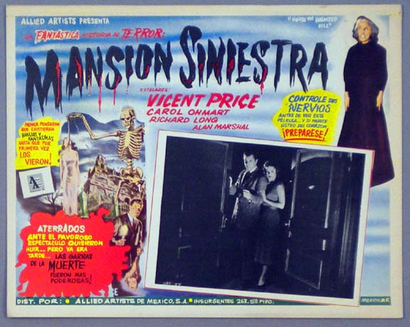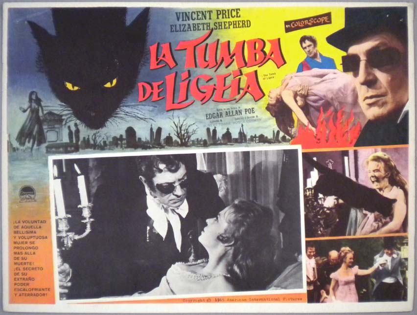 Beautiful Mexican jumbo lobby card (12.5x16.5") from the 1964 AIP horror film, TOMB OF LIGEIA, which starred Vincent Price, Elizabeth Shepherd, John Westbrook, Derek Francis and Oliver Johnston. The film was directed by Roger Corman, written by Robert Towne, and was based on a story by Edgar Allan Poe. $25 |
