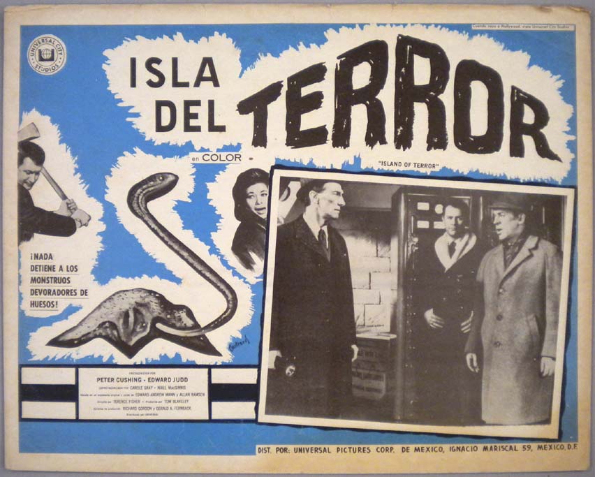 Classic Mexican jumbo lobby card (12.5x16.25") from the 1964 Hammer sci-fi / horror film, THE EVIL OF FRANKENSTEIN, which starred Peter Cushing, Peter Woodthorpe, Duncan Lamont, Sandor Eles and Katy Wild. $20 |