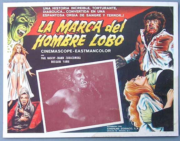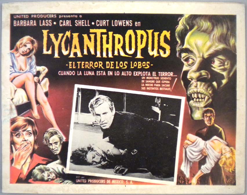 Beautiful Mexican jumbo lobby card (13x16.25") from the 1962 MGM / Austrian horror film, WEREWOLF IN A GIRL'S DORMITORY, which starred Barbara Lass, Carl Schell, Curt Lowens and Maurice Marsac. $20 each |