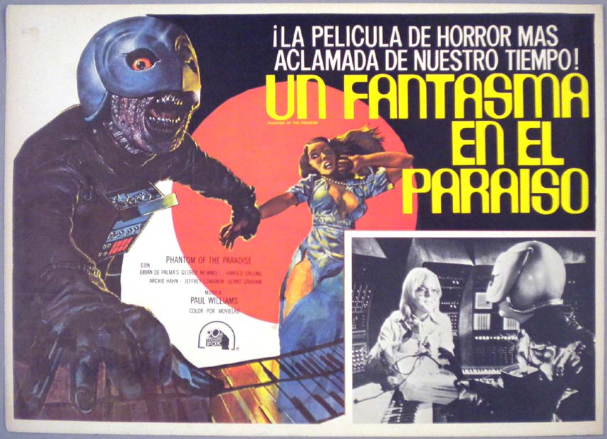 Beautiful Mexican jumbo lobby card (12x16.5") from the 1974 20th Century Fox musical / horror / comedy film, PHANTOM OF THE PARADISE, which starred Paul Williams, William Finley, Jessica Harper, George Memmoli and Gerrit Graham. The film was directed by Brian De Palma. $35 |