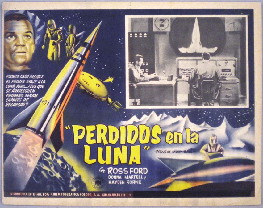 Beautiful Mexican jumbo lobby card (12.5x16") from the 1953 Lippert sci-fi / space travel film, PROJECT MOONBASE, which starred Ross Ford, Donna Martell, Hayden Rorke and Larry Johns. $45 |
