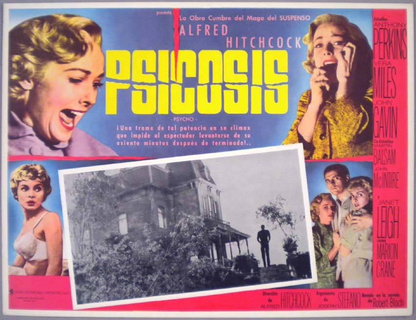 Beautiful Mexican jumbo lobby card (12.5x16.5") from the 1960 Paramount suspense / horror film, PSYCHO, which starred Anthony Perkins, Janet Leigh, Vera Miles, John Gavin, Martin Balsam and John McIntire. The film was directed by Alfred Hitchcock. $55 each |