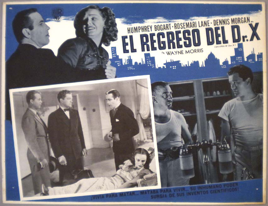 Great Mexican jumbo lobby card (12.5x16.25") from the 1939 Warner Brothers sci-fi / horror film, THE RETURN OF DR, which starred Wayne Morris, Rosemary Lane, Humphrey Bogart, Dennis Morgan, John Litel, Lya Lys and Huntz Hall. Who knew that Humphrey actually played a zombie!!! $45 |