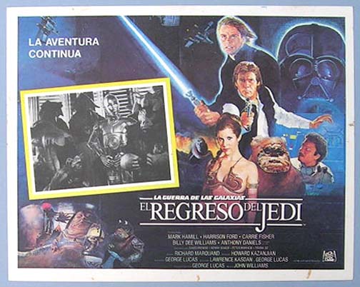 Beautiful Mexican lobby card (11x14") from the 1983 20th Century Fox sci-fi film, RETURN OF THE JEDI, which starred Mark Hamill, Harrison Ford, Carrie Fisher, Anthony Daniels, Billy Dee Williams, Alec Guinness and David Prowse. This was, of course, the third film in the original STAR WARS trilogy. $45 each |