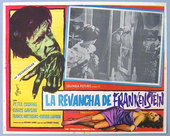 Beautiful Mexican jumbo lobby card (12.5x15.5") from the 1958 Hammer horror / sci-fi film, THE REVENGE OF FRANKENSTEIN, which starred Peter Cushing, Francis Matthews, Eunice Gayson, Michael Gwynn, John Welsh and Lionel Jeffries. $20 each |