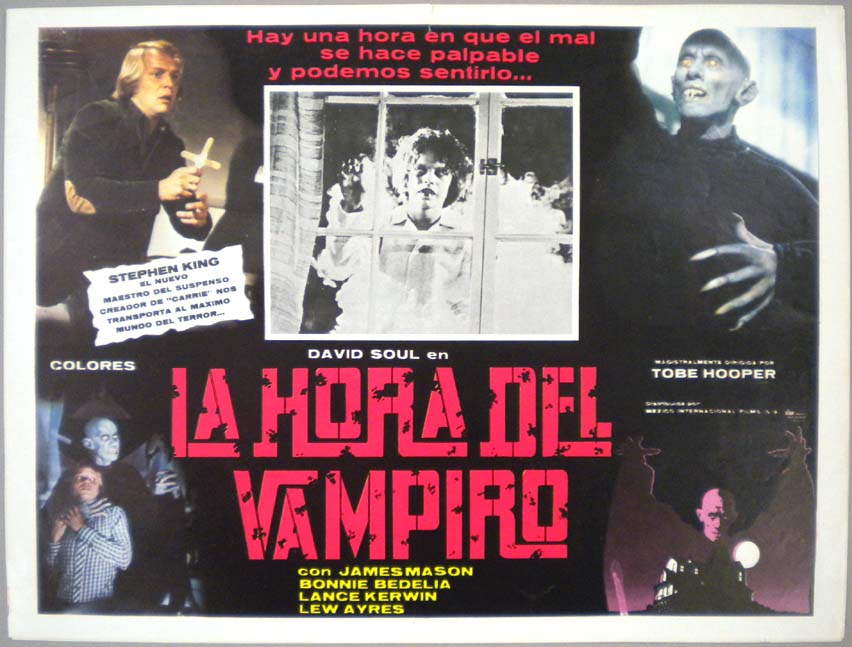 Beautiful Mexican jumbo lobby card (12x16") from the 1979 Warner Brothers horror / vampire telefilm, SALEM'S LOT, which starred David Soul, James Mason, Lance Kerwin, Bonnie Bedelia, Lew Ayres, Julie Cobb, Elisha Cook Jr. and Reggie Nalder. The film was directed by Tobe Hooper and was based on a novel by Stephen King. These glossy cards are printed on thinner paper than usual for typical Mexican lobby cards. $20 each |