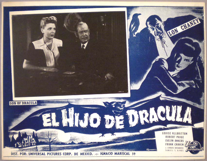 Classic Mexican jumbo lobby card (13x16.5") from the 1943 Universal horror / vampire film, SON OF DRACULA, which starred Lon Chaney Jr., Robert Paige, Louise Allbritton, Evelyn Ankers and Frank Craven. The film was directed by Robert Siodmak. The card was likely a reissue from the 1950s or 1960s. $35 each |