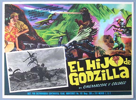 Beautiful Mexican jumbo lobby card (12.5x16.5") from the 1967 Toho sci-fi / giant monster film, SON OF GODZILLA, which starred Tadao Takashima, Akira Kubo, Bibari Maeda, Akihiko Hirata, Yoshio Tsuchiya and Kenji Sahara. The film was released in Japan as, Kaijuto no Kessen: Gojira no Musuko. $45 each |
