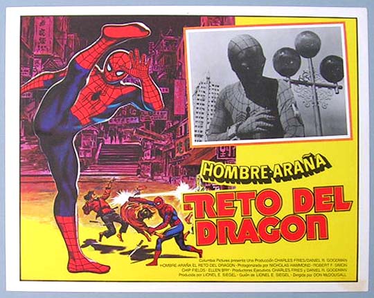 Beautiful Mexican lobby card (11x14") from the 1979 Fox telefilm, SPIDERMAN, THE DRAGON'S CHALLENGE, which starred Nicholas Hammond, Robert F. Simon, Rosalind Chao, Benson Fong and Ted Danson. $20 each |