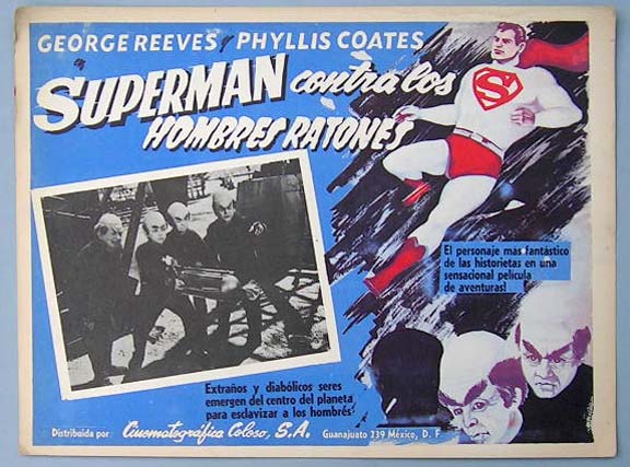 Colorful Mexican jumbo lobby card (11.5x15.5") from the 1950s MPTV adventure / sci-fi film, ADVENTURES OF SUPERMAN, which starred George Reeves, Noel Neill, Jack Larson, John Hamilton and Robert Shayne. This card is from a reissue of the film. $15 each |