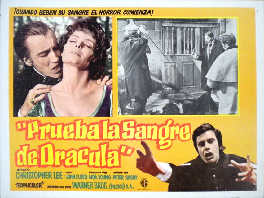 Beautiful Mexican jumbo lobby card (12.25x16.5") from the 1970 Hammer vampire / horror film, TASTE THE BLOOD OF DRACULA, which starred Christopher Lee, Geoffrey Keen, Gwen Watford and Linda Hayden. $25 |