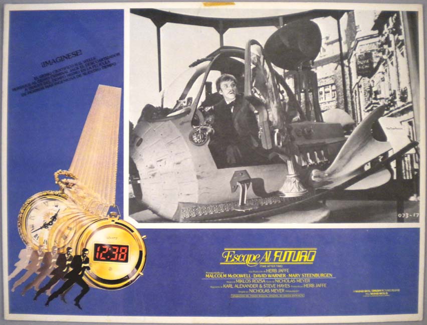 Original Mexican jumbo lobby card (12.5x16.5") from the 1979 Warner Brothers time travel / science fiction / fantasy / horror film, TIME AFTER TIME, which starred Malcolm McDowell as H. G. Wells, and David Warner as Jack the Ripper. The film also featured Mary Steenburgen, Charles Cioffi and Kent Williams. $15 |