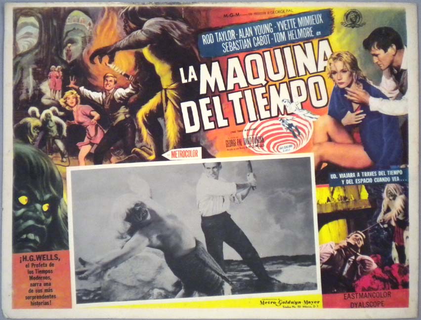 Beautiful Mexican jumbo lobby card (12.5x16.5") from the 1960 MGM sci-fi / monster film, THE TIME MACHINE, which starred Rod Taylor, Alan Young, Yvette Mimieux and Sebastian Cabot. The film was directed by George Pal and was based on a novel by H.G. Wells. The card has some edge wear along the borders -- especially the top border -- but this flaw does not greatly affect the colorful image area. $65 |