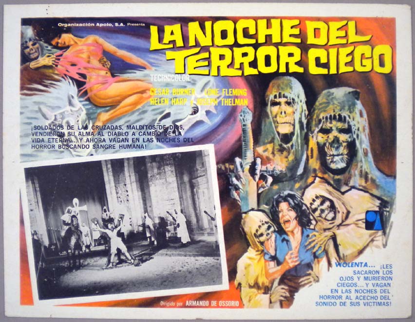 Beautiful Mexican jumbo lobby card (12x15.5") from the 1972 Spanish horror / zombie film, THE TOMB OF THE BLIND DEAD, which starred Lone Fleming, Cesar Burner, Maria Elena Arpon and Jose Thelman. The film was directed by Amando de Ossorio. This was the first film in the BLIND DEAD series! $35 |