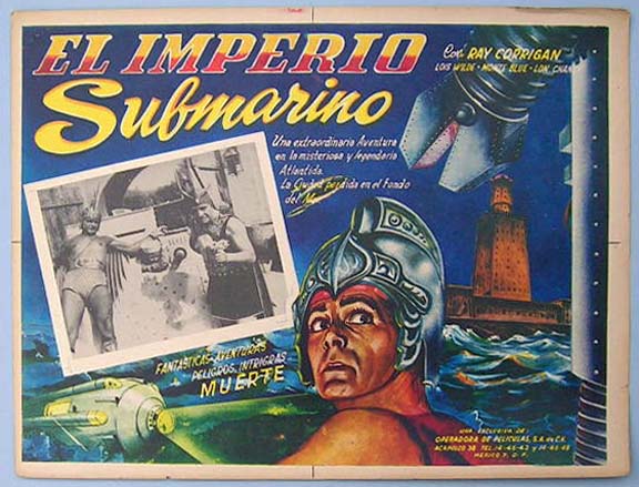 Beautiful Mexican jumbo lobby card (12.5x16.5") from the 1936 Republic sci-fi serial, UNDERSEA KINGDOM, which starred Ray Crash Corrigan, Lois Wilde, Monte Blue, William Farnum, Boothe Howard, Raymond Hatton, C. Montague Shaw, Smiley Burnette, Lon Chaney Jr. and the Republic Robot. $35 |