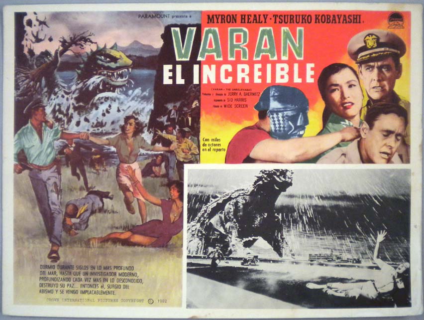 Beautiful Mexican jumbo lobby card (12.75x16.75") from the 1962 Toho sci-fi / giant monster film, VARAN THE UNBELIEVABLE, which starred Myron Healey, Tsuruko Kobayashi, Clifford Kawada, Derick Shimatsu and Kozo Nomura. $25 |