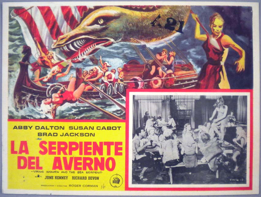 Beautiful Mexican jumbo lobby card (12.25x16") from the 1957 AIP fantasy / adventure / horror film, VIKING WOMEN AND THE SEA SERPENT, which starred Abby Dalton, Susan Cabot, Brad Jackson, June Kenney, Richard Devon, Betsy Jones-Moreland and Jonathan Haze. The film was directed by Roger Corman. There is an inventory number stamped on the upper center area of the card -- but this was done by the distributor -- it is not a flaw caused by usage. Otherwise, the card is in very nice shape. $25 |