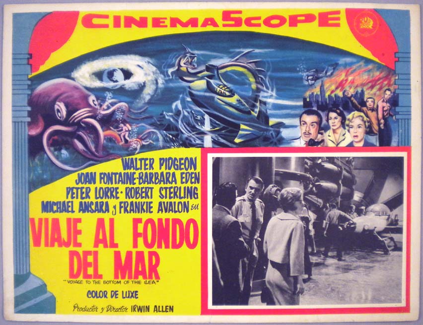 Beautiful Mexican jumbo lobby card (12.75x16.5") from the 1961 20th Century Fox sci-fi / undersea adventure film, VOYAGE TO THE BOTTOM OF THE SEA, which starred Walter Pidgeon, Joan Fontaine, Barbara Eden, Peter Lorre, Robert Sterling, Michael Ansara and Frankie Avalon. $20 |