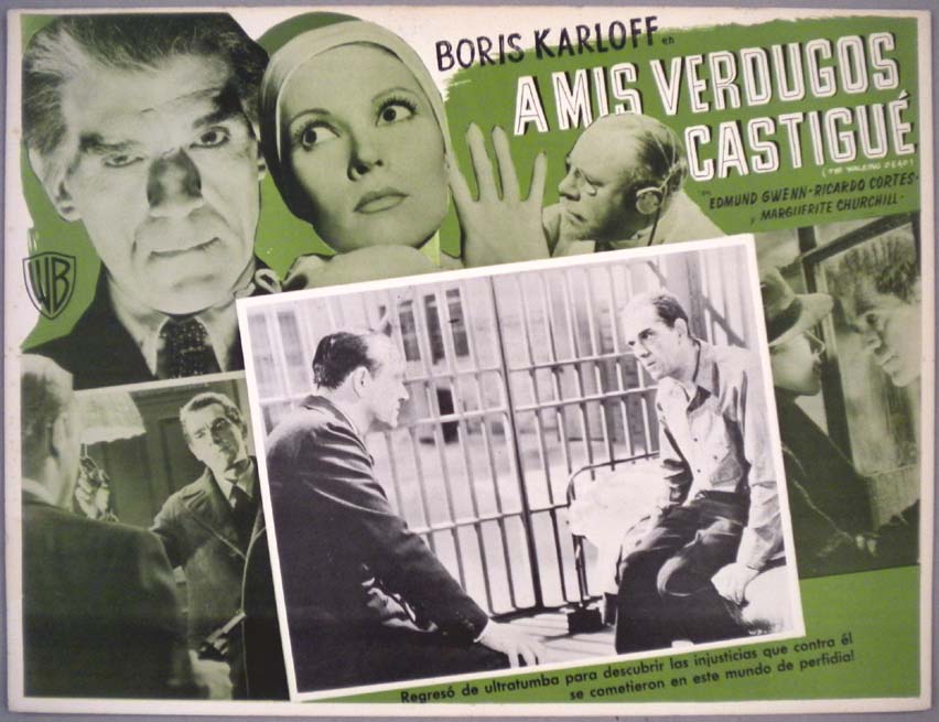 Classic Mexican jumbo lobby card (12.25x16.5") from the 1936 Warner Brothers sci-fi / horror / gangster film, THE WALKING DEAD, which starred Boris Karloff, Ricardo Cortez, Edmund Gwenn and Marguerite Churchill. The film was directed by Michael Curtiz. $25 each |